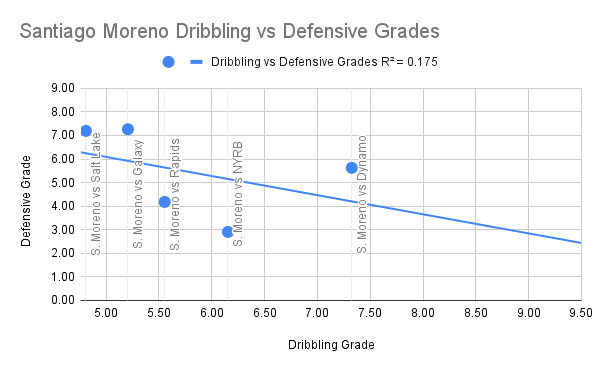It was a game of ups and downs for Yimmi as the Colombian did a good job of pressing and creating opportunities with his passing; however, his dribbling was very poor. Part of Yimmi’s struggles in this game could definitely be due to the midfield’s inability to move the ball forward, as Yimmi ranked in the 28th percentile for total actions and just sixth percentile for touches in the attacking third. Even when Yimmi got on the ball, he struggled to move forward as he ranked in just the 12th percentile for progressive distance per carry. Because of these two things, Yimmi quite possibly could have converted into a more defensive role during the game, which provided the freedom for Santiago Moreno to get forward and create opportunities. This is supported by Yimmi’s 11 recoveries (highest percentile possible), seven defensive duels, and solid pressing numbers. All of Yimmi’s defensive statistics from this match were well above-average, so this scenario that I’m describing is certainly a possibility of what actually happened.