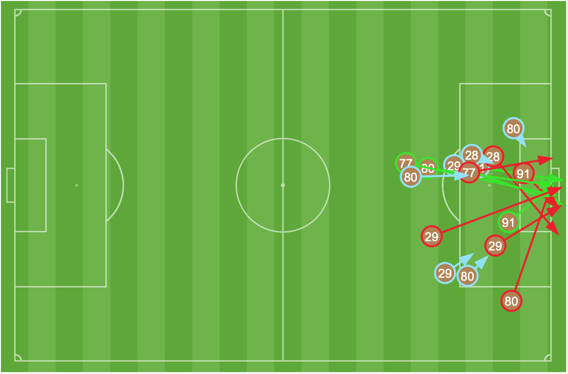 As you can see below, most of OKC’s attempted crosses became key passes; just one of fifteen (!!) successful crosses resulted in nothing. These crosses often connected because of a T2 player’s lack of tracking a runner or even just failing to keep track of their marker in the box, even for just a split-second.